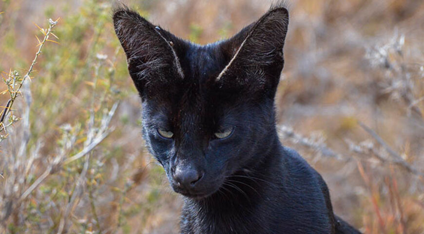 African serval cats normally have tan fur with small black spots much like a cheetah, but legend is that a small handful with jet-black fur roam sub-Saharan Africa. The melanistic serval cat as it’s known, is often discussed, but rarely seen. To begin with, the serval is a relatively small cat. So small that it is very hard to spot in relation to their vast environment. Their long limbs and big ears that seem slightly too large for their small heads are almost the only way to tell that they are not domestic cats.