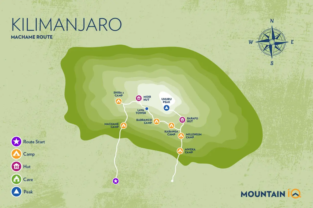 This is now the most popular route on the mountain. Compared with Marangu, the days on Machame are longer and the walks are steeper. The Machame route is considered a difficult route, and is better suited for more adventurous folks and those with some hiking or backpacking experience. The route begins from the south, then heads east, traversing underneath Kilimanjaro’s southern ice field before summiting.